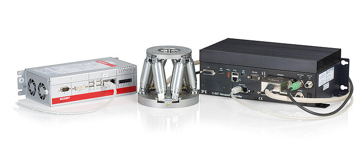 The scope of delivery includes the controller, a software package, and a power adapter for the power supply. It is recommended to order the hexapod mechanics and a suitable cable set together with the controller so that the components can be adapted to each other. A PLC master controller is not included in the scope of delivery!