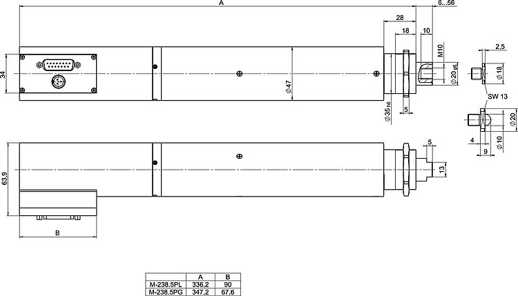 High-load linear actuator; DC gear motor with ActiveDrive; 50 mm travel range; 400 N feed force; 30 mm/s maximum velocity; ball screw; incremental linear encoder, 100 nm sensor resolution; limit switches: Hall effect
