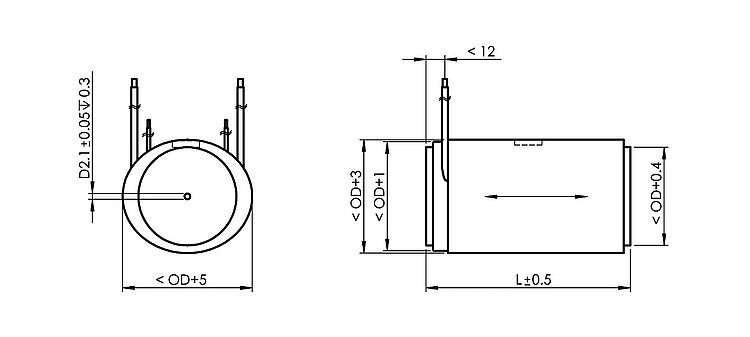 Displacement | Diameter OD | Length L | Blocking force | Stiffness | Electrical capacitance | Resonant frequency | |
