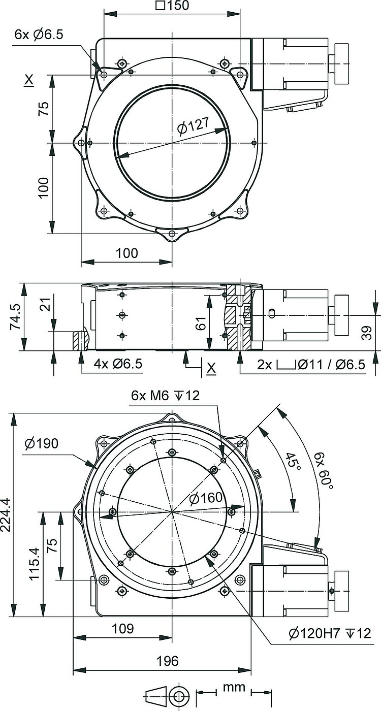 Worm drive with high gear ratio for precision positioning. Excellent flatness and concentricity due to preloaded crossed roller bearings. Large aperture with 120 mm Ø. Two adjustable limit switches.