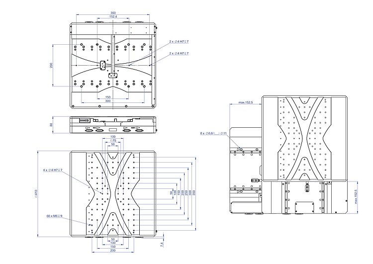 High-precision XY stage, ironless 3-phase linear motor; 305 mm x 305 mm travel range (X × Y); 50 N load capacity; 200 mm/s × 200 mm/s maximum velocity; incremental linear encoder, 20 µm sensor signal period, sin/cos, 1 V peak-peak